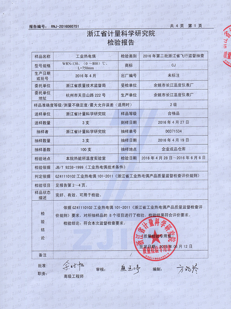 2016年工業(yè)熱電偶檢驗(yàn)報(bào)告